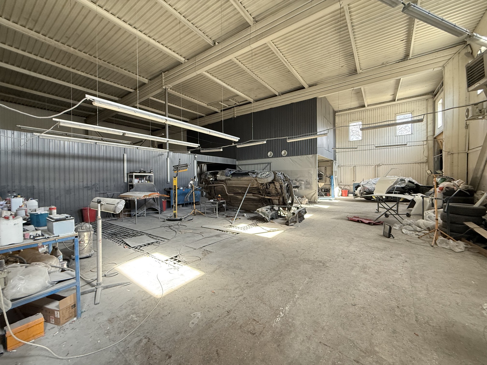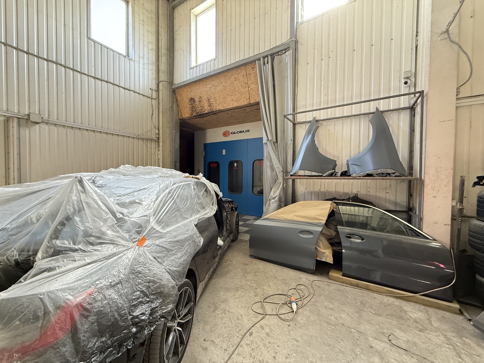 Обладнання для ремонту автомобілів (Камера для фарбування Globus, Компресор поршневий 2-х циліндровий AIR PRESS B7000/500 FT 10/HK 1500-500, 1500 л/м, 11 бар, 7,5 кВт, 380 V, 500 л, Італія, Верстак-стелаж (11,7+10,3+5,5), Верстак виробничій (10 одиниць) Візок для інструментів Системи стілажні Ролетні системи Авто-Підʼйомник Стапель платформний Виставкова Фотозона Витяжна вентиляція Відеоспостереження Освітлення Пожежна сигналізація тощо)