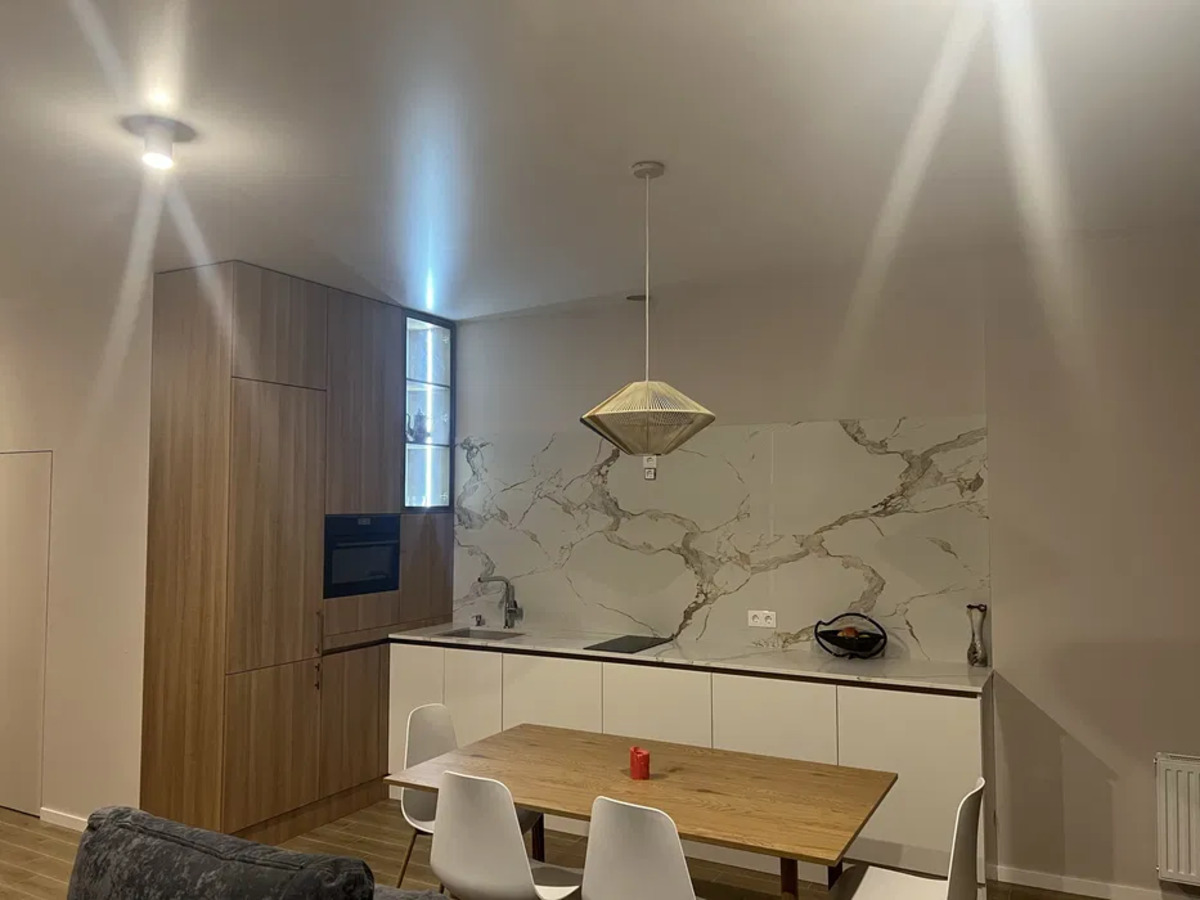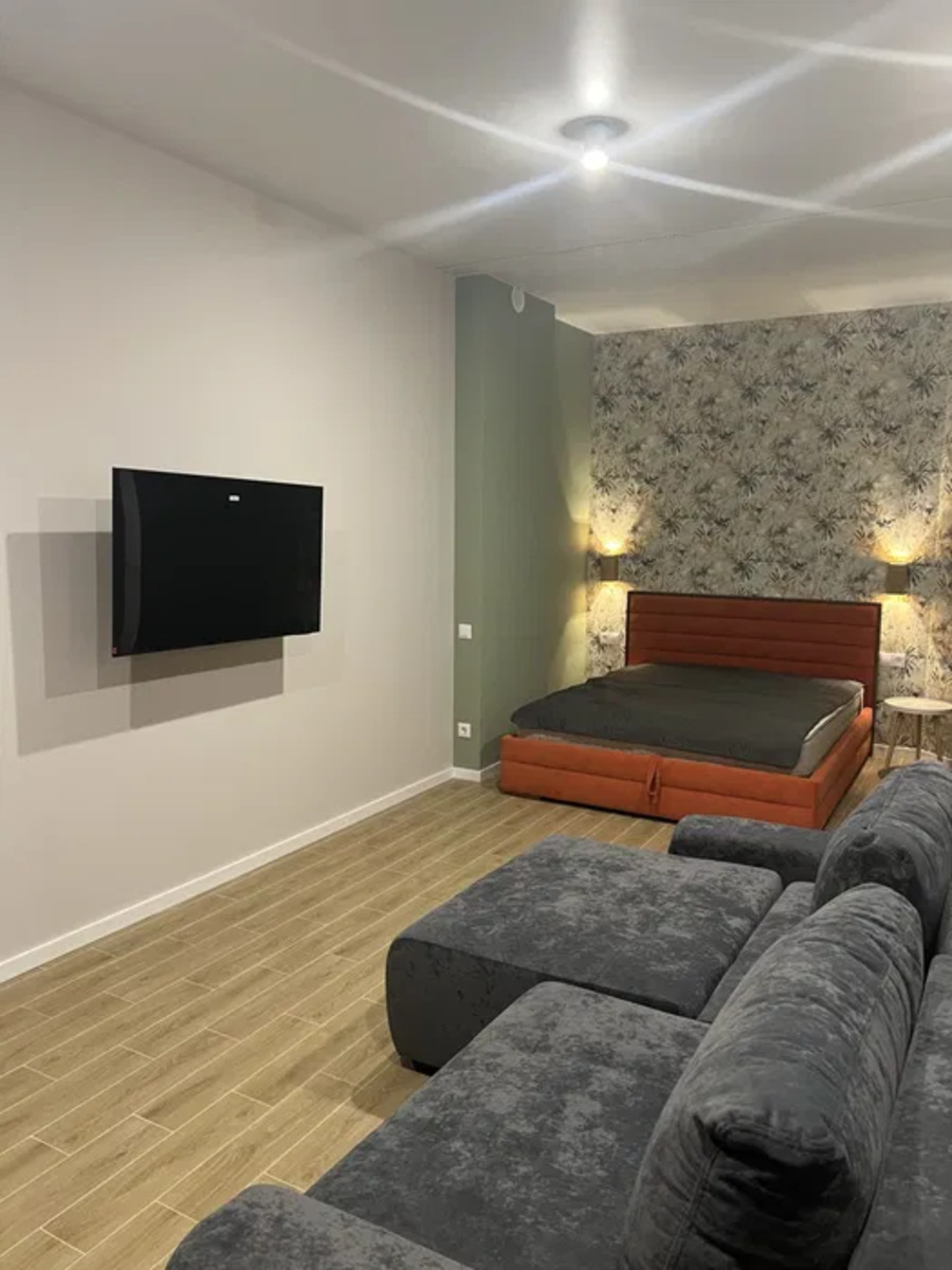Сучасний інтер’єр поєднує стиль та функціональність. Велика кімната зонована на спальну та відпочинкову зону, а стильні меблі – зручне ліжко, м’який кутовий диван і настінний телевізор – створюють атмосферу комфорту.