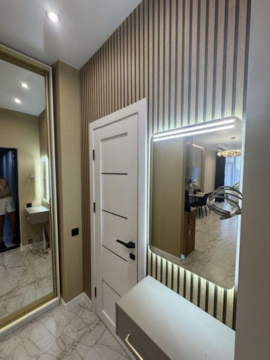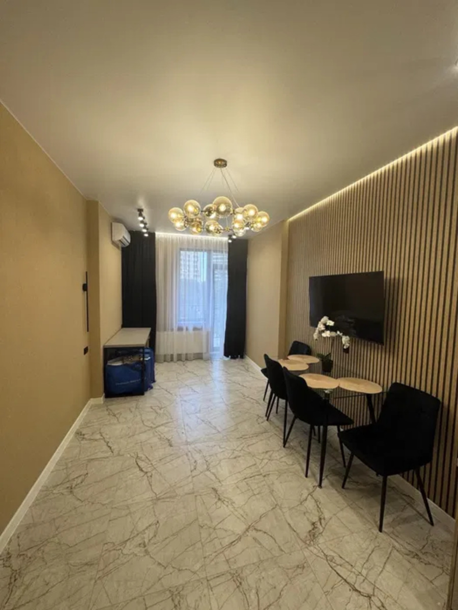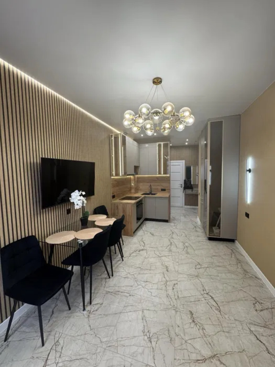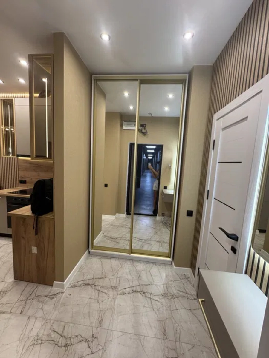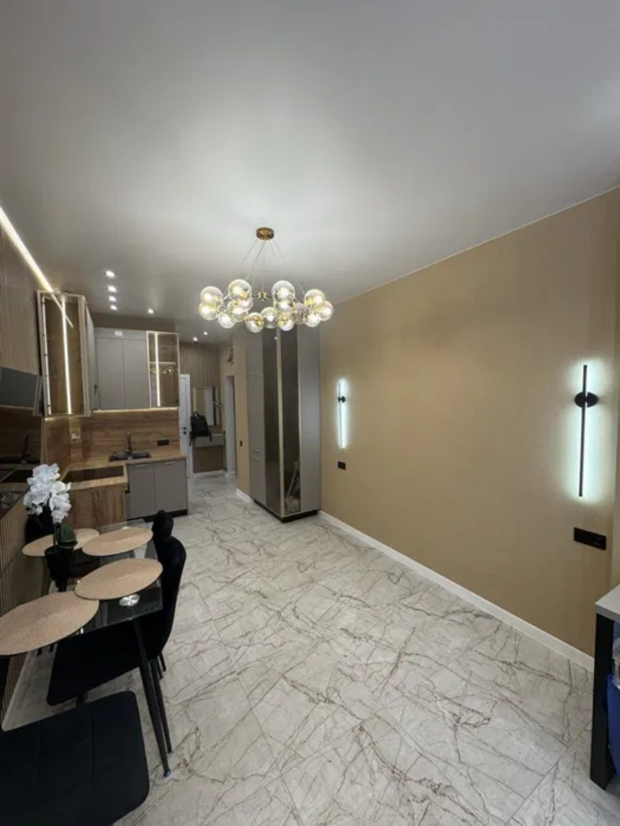 Пропдається сучасна квартира-студія з дизайнерським ремонтом у новобудові бізнес-класу — ЖК «Єллада», 1 секція. Квартира розташована на 5-му поверсі 26-поверхового монолітного будинку.Планування: студія з балконом та лоджією.Санвузол: суміжний.Ремонт: євроремонт із шумоізоляцією та гідроізоляцією стін.