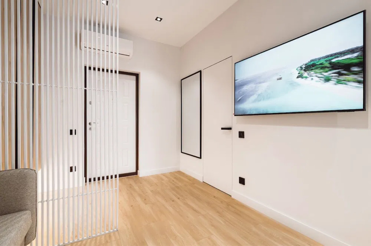 Основні переваги:Планування: спальня 11 м², кухня-вітальня 12 м², зона ТВ 8 м², простора прихожа 5 м², санвузол 6 м², балкон 1,7 м²..Ремонт: декоративна штукатурка, стінові панелі, приховані двері, французька дерев’яна підлога.